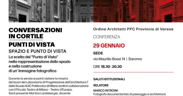 SARONNO – Giovedì 29 gennaio a Saronno si terrà una conferenza dedicata al tema dello sguardo e della rappresentazione dello spazio, promossa dall’Ordine degli Architetti della provincia di Varese nell’ambito del ciclo “Conversazioni in cortile”.