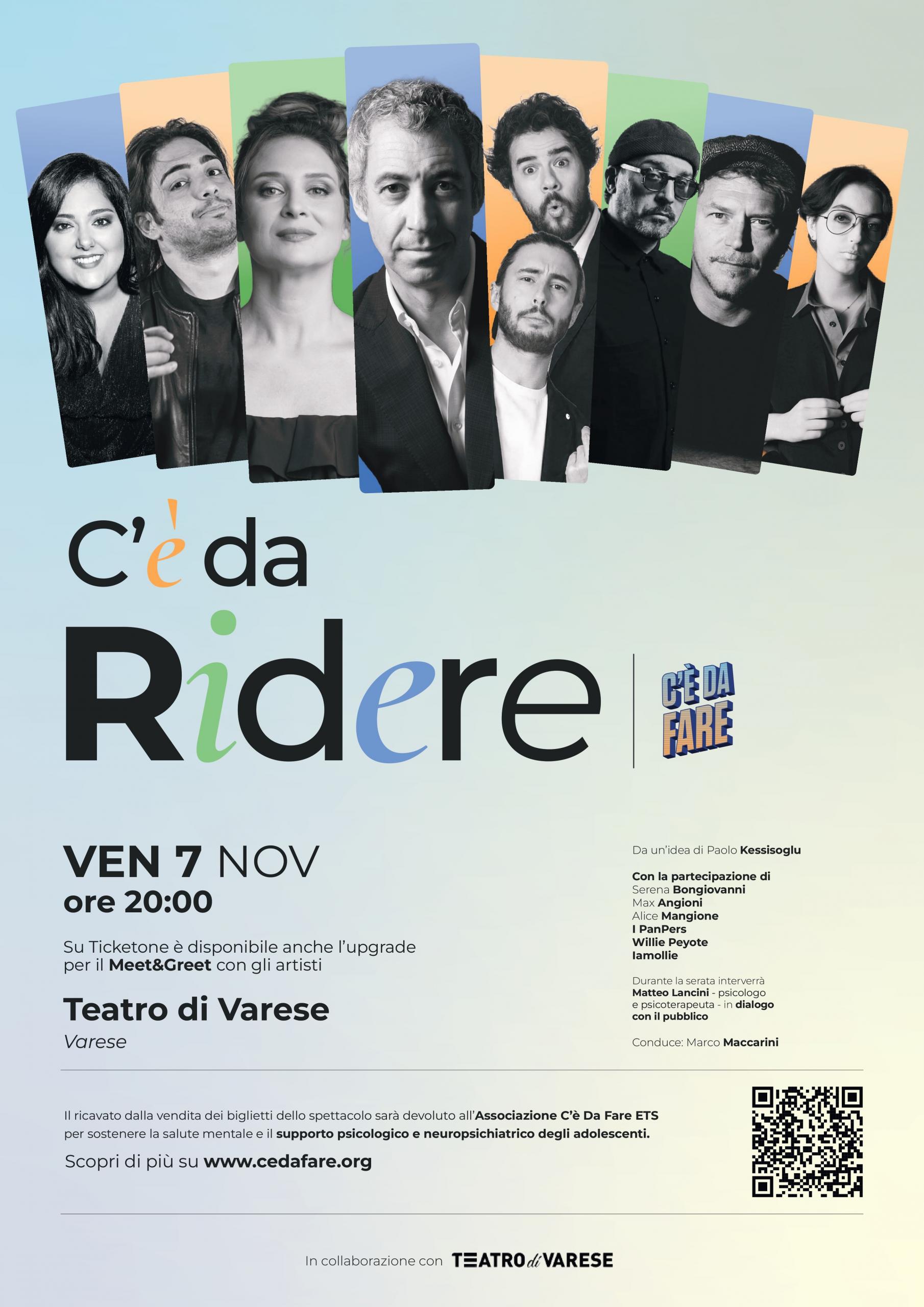 VARESE – C’è da Ridere – il primo tour teatrale italiano interamente dedicato alla salute mentale – sale sul palco del Teatro di Varese venerdì 7 novembre per l’ultima tappa dell’anno della tournée unendo comicità, musica e informazione. Un progetto ideato da Paolo Kessisoglu e promosso dall’associazione non profit C’è Da Fare (cedafare.org), fondata dallo stesso Kessisoglu insieme a Silvia Rocchi, per integrare il sistema sanitario nazionale con iniziative di sostegno psicologico e neuropsichiatrico rivolte ai giovani.
