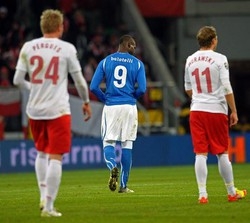 Nel primo tempo i padroni di casa partono forte fin da subito e la Nazionale viene messa alle corde: prima Peszko (tiro di potenza fuori di poco), poi Lewandowski (esterno della rete di testa su azione di angolo) sfiorano il vantaggio. Ma ci pensa Balotelli a caricarsi sulle spalle la squadra: al 31′ Marchisio recupera la palla a centrocampo e serve l’attaccante del Manchester City. Il pallonetto da 30 metri sorprende un distratto Szczesny. E’ il gol del vantaggio e prima marcatura in azzurro per SuperMario.
