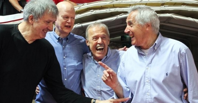 «Caro Gianmarco, non autoflagellarti». L’appello, sincero, viene da un grande ex come Marino Zanatta (nella foto, il primo a destra con Ossola, Morse e Lucarelli). Domenica sera, subito dopo la rocambolesca sconfitta con Reggio Emilia, il coach biancorosso si era assunto tutte le responsabilità del ko, con particolare riferimento alla scelta operata da Varese di non fare fallo, avanti 80-77, a 8’’ dallo scadere del tempo regolamentare.