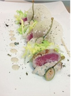 Componete il piatto alternando una fetta di filetto con l’insalata, per tre volte, disponete su ogni fetta di carne una quenelle (preparazione classica della cucina internazionale, a forma di uovo) di salsa tonnata densa e un fiore di cappero.