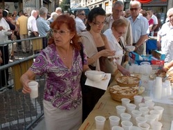 la distribuzione del brodo. Complice il vento fresco che soffiava sulla città, a rendere meno afoso il clima di una domenica di luglio dal cielo terso, in molti hanno voluto bere un bicchiere del brodo caldo. Magari acquistando una delle tazze in ceramica dedicate alla festa della contrada, realizzate dal comitato che, ogni anni, organizza le celebrazioni.