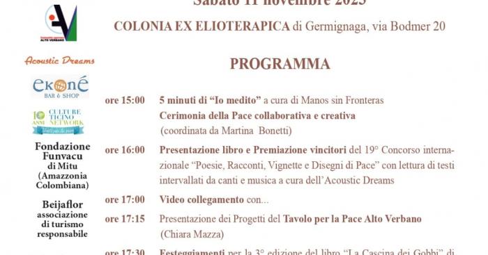 GERMIGNAGA – Si è conclusa l’edizione numero 21 del Concorso internazionale di “Poesie, Racconti, Vignette e Disegni di Pace e di Nonviolenza”, appuntamento che accompagna il Forum della Pace e della Nonviolenza attiva, in programma l’8 e il 9 novembre a Germignaga, con eventi collegati anche a Luino, Brezzo di Bedero e Sesto Calende.