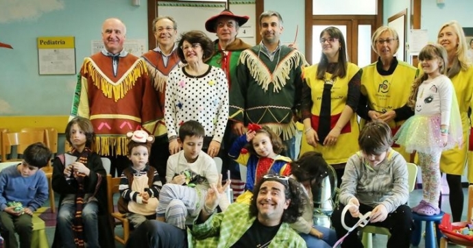 «Per noi si tratta del ventitreesimo anno del Carnevale in corsia» spiega Emanuela Crivellaro, fondatrice del Ponte del Sorriso, che compie quest’anno il quarto di secolo di vita. Una festa molto bella, che i bambini hanno preparato nemmeno troppo in anticipo, veramente in una manciata di ore, con le volontarie: con loro, armati di creatività, forbici e pinzatrice, hanno creato costumi di carta crespa e di materiale vario attinto dalla sala giochi.