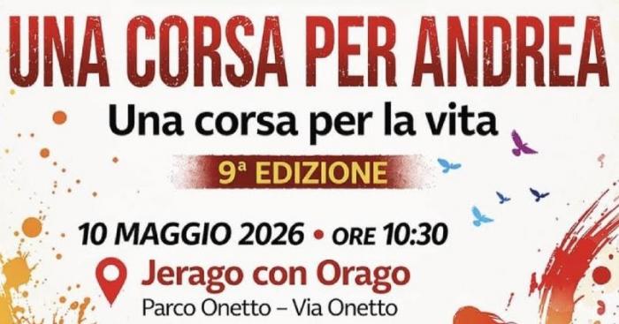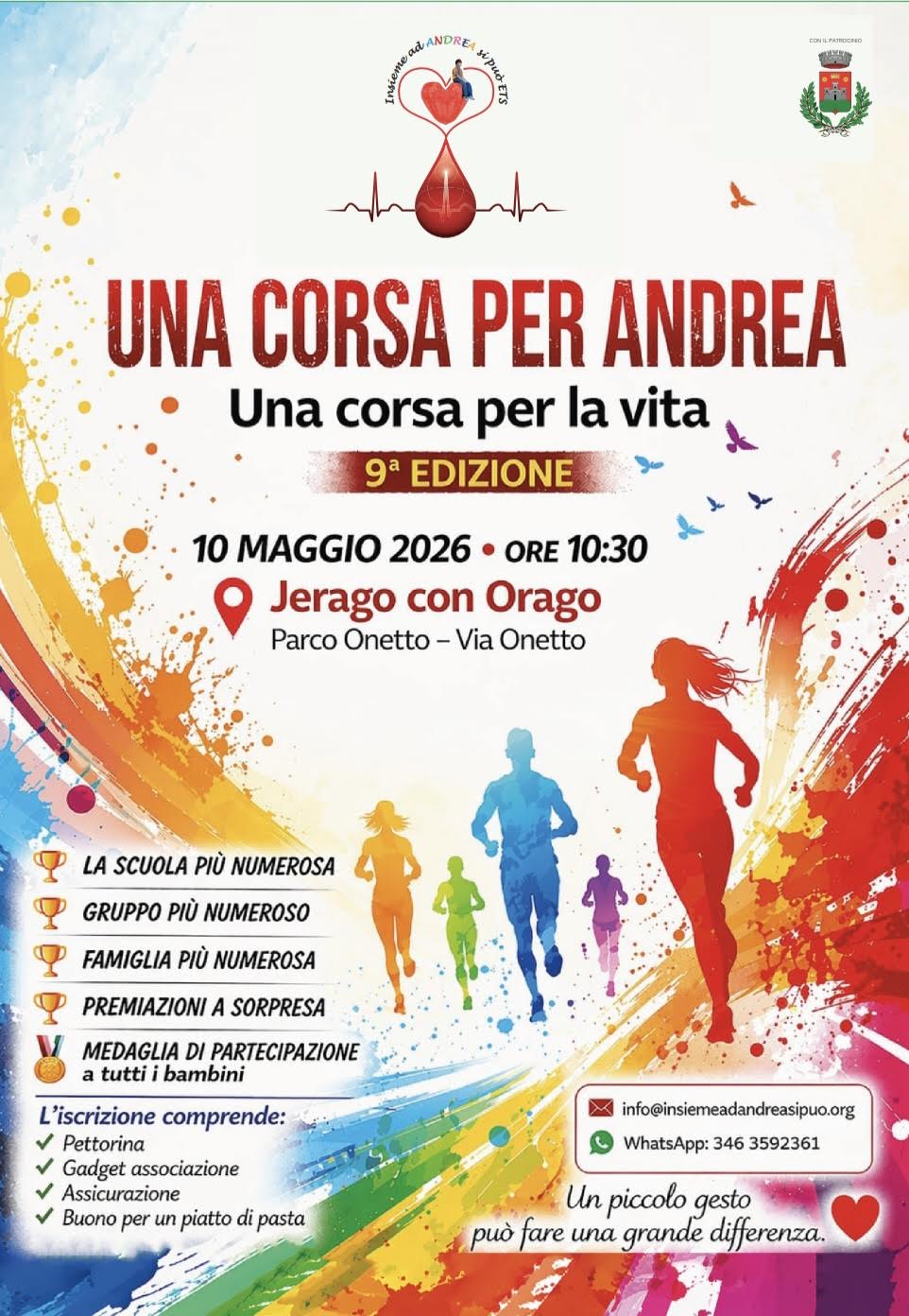 Jerago con Orago si prepara a vivere una giornata all’insegna della solidarietà e dello sport. Domenica 10 maggio torna “Una corsa per Andrea, una corsa per la vita”, giunta alla sua nona edizione. La manifestazione, promossa dall’associazione “Insieme ad Andrea si può ETS” con il supporto del Comune e di numerose realtà del territorio, nasce per trasformare il ricordo del piccolo Andrea in un aiuto concreto alla ricerca scientifica contro le leucemie infantili.