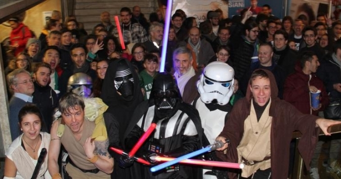 Ieri sera, in un cinema vicino vicino… una folla stellare ha preso d’assalto le sale e i suoi spettatori. C’era Darth Vader che ha tirato fuori la sua spada laser rossa e ha sfidato un maestro Jedi in un super duello tra pop-corn caldi e bibite gassate, Kylo Ren, invece, ha tirato fuori il suo smartphone e si è fatto un selfie con un bambino, letteralmente in adorazione, Rey e Obi-Wan Kenobi si sono fatti un giro per l’atrio del cinema scortati da due Stormtrooper mentre Luke Skywalker, con il maestro Yoda, ha provato qualche trucco Jedi su Andrea Cervini, responsabile del Miv, per provare ad estorcergli un biglietto. Anche lui, però, è un Maestro, uno che la Forza la conosce e la controlla e così li ha fatti mettere tutti in coda, uno