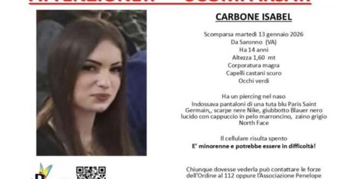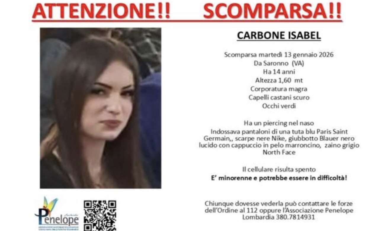 SARONNO – Cresce la preoccupazione a Saronno per la scomparsa di Isabel Carbone, 14 anni, di cui non si hanno più notizie da martedì 13 gennaio. La segnalazione è stata diffusa nelle ultime ore e rilanciata anche dall’Associazione Penelope Lombardia, che supporta le famiglie nelle ricerche di persone scomparse.