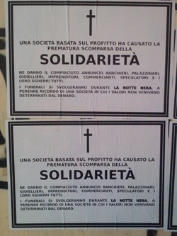 Quest’anno il balzo in avanti con la proposta di un “funerale” alla solidarietà che sarà celebrato durante la notte nera. Nonostante la presa di posizione non sia proprio una novità l’impatto su Saronno è stato molto forte: i finti annunci funebri, con cui nottetempo è stato tappezzato il centro cittadino, da corso Italia alla stazione, hanno suscitato molta curiosità e anche un po’ di preoccupazione visto che non vengono forniti dettagli sulle intenzioni dei giovani.