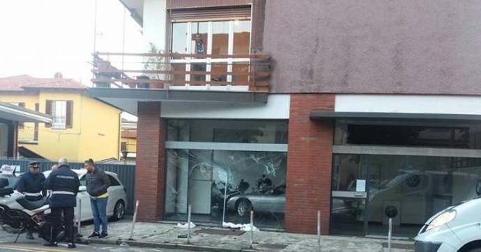 Scontro tra auto e moto: sfondata la vetrina di un negozio