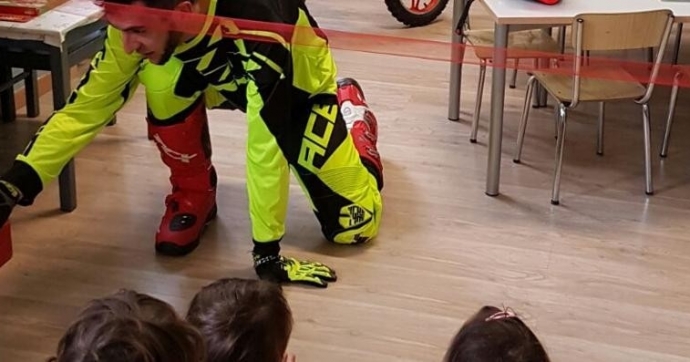 «È arrivato con la tuta e il casco in sella a una mini moto. I bimbi si sono divertiti e quelli meno intimoriti hanno provato il casco e chiesto di salire sulla moto». Un momento di divertimento per i piccini e di solidarietà per i grandi.