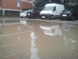 Uno spiazzo sterrato dove posteggiano i residenti, ma anche i clienti del punto vendita di giornali. Con la pioggia, però, si forma una pozza di notevoli dimensioni. Colpa di un pozzo perdente, ovvero un tombino, che si trova al centro del parcheggio.