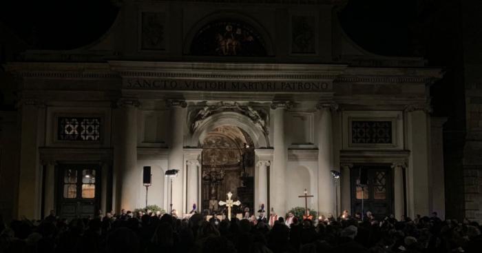 Dopo un primo momento di riflessione, è partita la processione che ha attraversato il centro cittadino lungo il percorso via Crispi, piazza San Giovanni XXIII, via Morandi, via Indipendenza, via Veratti, via Broggi e corso Matteotti, fino all’arrivo in piazza San Vittore.